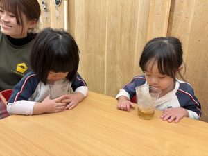 続いて、お茶を淹れる様子をみんなで見学しました。お湯を注ぐと心地よい音が響き、透明だったお湯が綺麗な緑色へと変化していきます。最後は、自分たちでそのお茶をいただき、口いっぱいに広がる豊かな風味を味わいました。