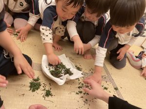 「ひとつも無駄にせず、空間の美しさを保つ」 そんな素敵な掃除方法が文化として根付いている…。子どもたちは、茶葉の感触を楽しみながら、物を大切にする心や自然の恵みを肌で感じ取ってくれています。