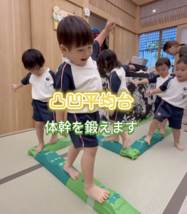 ・凸凹(でこぼこ)平均台:不安定な足場を進むことで、自然と体幹が鍛えられます。足の裏の感覚も大切にする活動です。