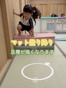 ・マット登り降り:マットをよじ登ったり降りたり。全身を使って動くことで、足腰が強くなります。