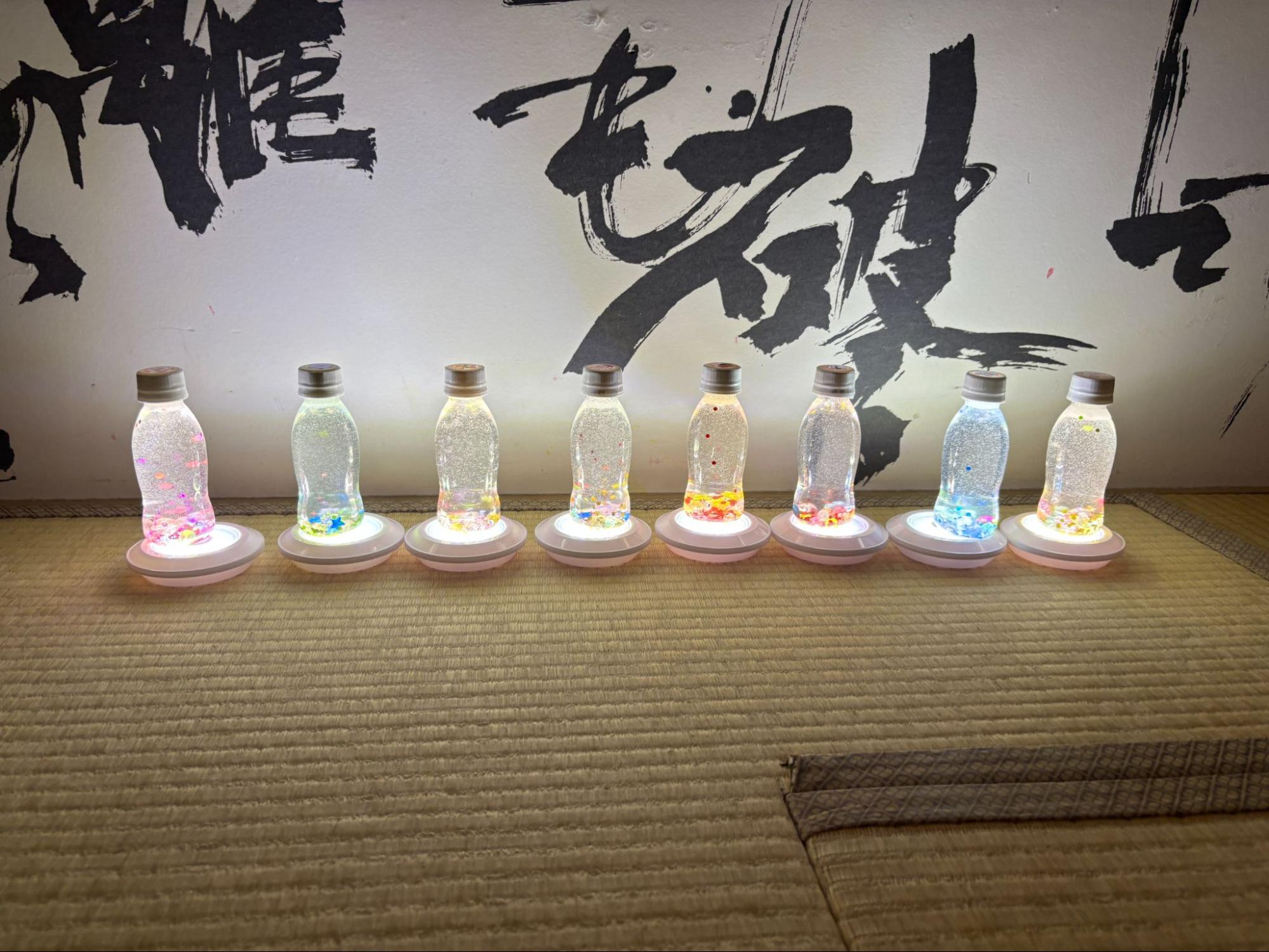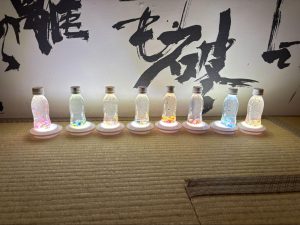 部屋を少し暗くして、自分たちで作ったボトルにライトを当ててみます。