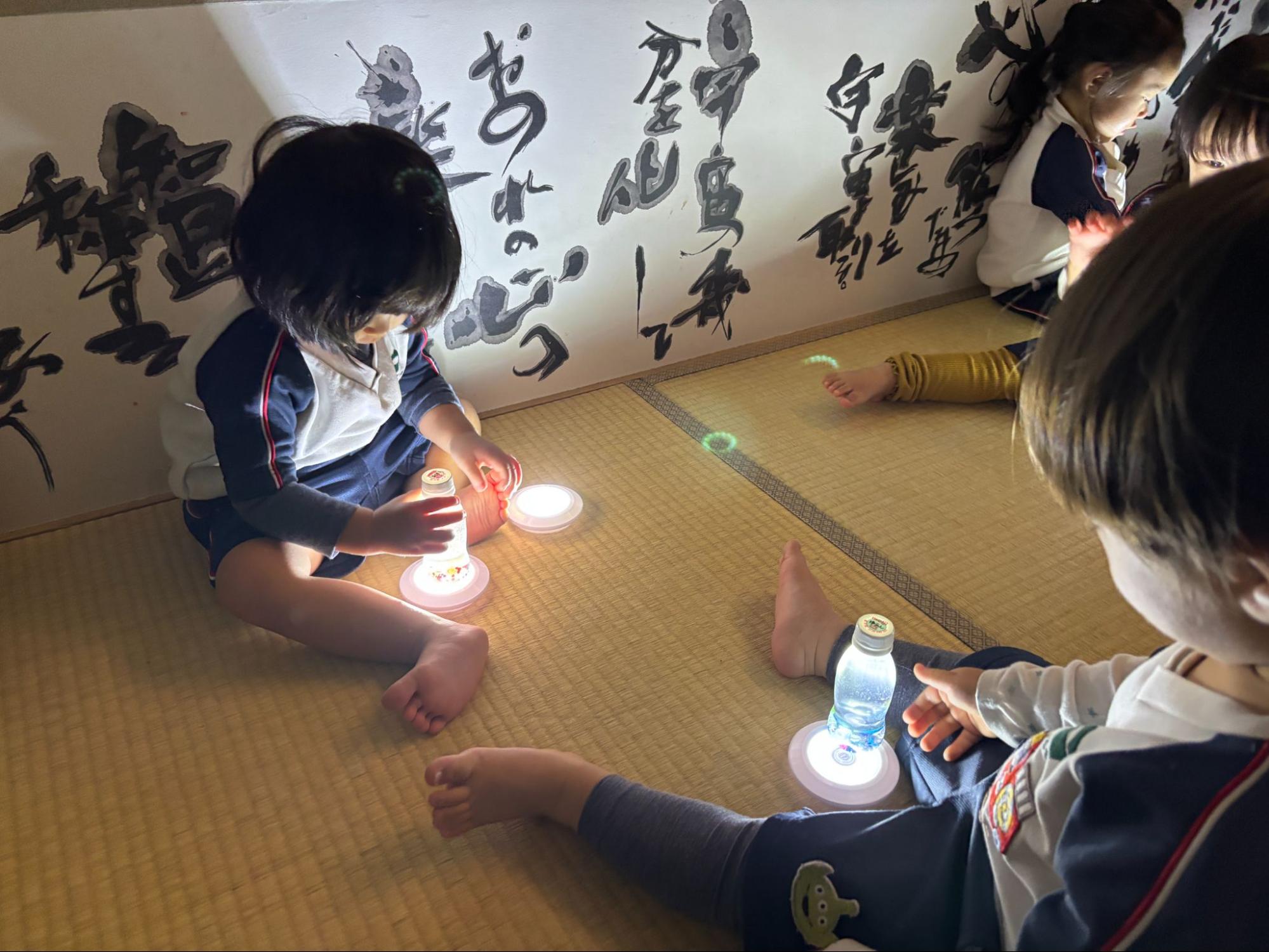 ライトの光を浴びて、ボトルの中のラメやビーズがキラキラと輝く様子に、子どもたちの心はすっかり奪われたようです。
