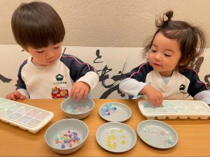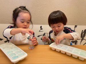 製氷器というちょっとした仕掛けを通して、私たち保育者は、一人ひとりの指先の発達や、言葉の理解の仕方を丁寧に見守ることができました。どの子の姿も、成長の真っ最中です。